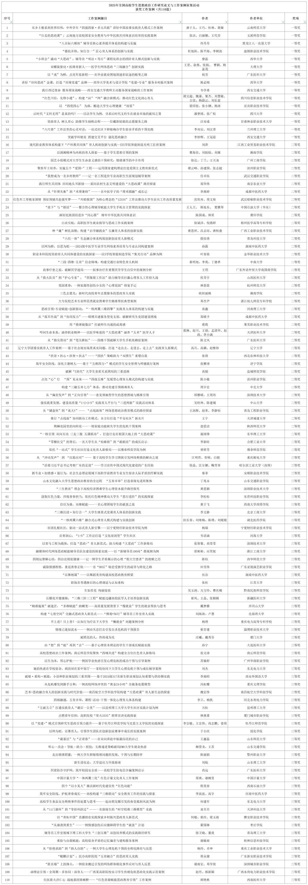 获奖工作案例名单(共110篇)