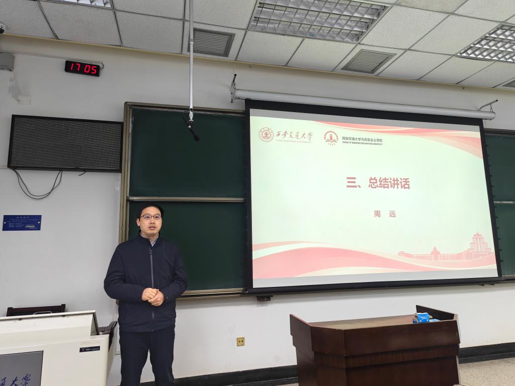 校党委常委、组织部部长、学院党委书记周远在总结讲话中对全体教师过往一年取得的成果表示祝贺,对全院教职工的辛勤付出表达感谢。他立足学生、教师、人才三大坐标,系统分析了学院当前发展的机遇与挑战。他指出,学校办学规模扩大、学生数量增长,为思政课建设和学院发展拓展了空间;同时教师队伍建设的标准和门槛将持续提升,对学院内涵式发展提出了更高要求。他表示,过去一年学院各项工作成果丰硕,但横向对比仍存在发展压力,特别是在科研体量和人才规模方面亟待提升。对此,他希望全院教师紧扣学校空间建设新需求,深耕思政课改革创新,围绕教育科技人才一体化等重点内容,推动党的创新理论与实践深度融合,以更大担当、更实作为为学校高质量发展贡献马院力量。