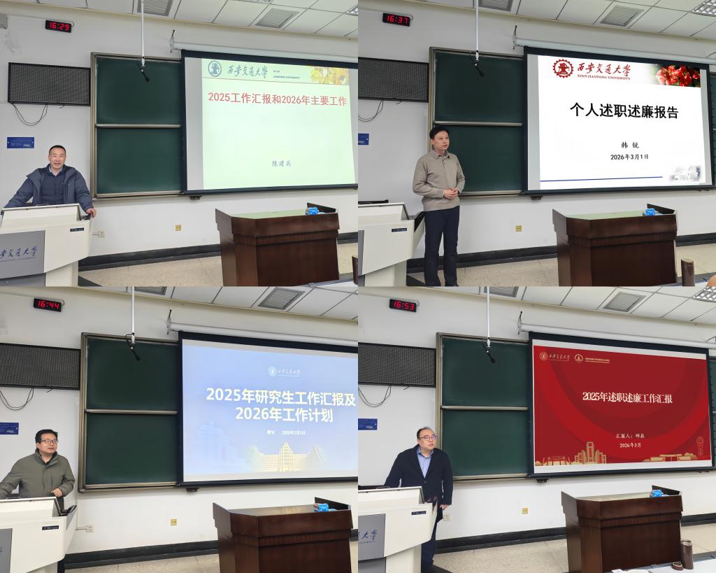 副院长陈建兵、韩锐、梁军,党委副书记邱辰分别对2025年本科生培养及思政课建设工作、科研及外事工作、研究生培养工作、学生工作等分管工作进行了总结,并围绕岗位职责和重点工作任务,汇报了2026年工作计划。全院教职工现场对领导班子和班子成员进行了民主评议打分。